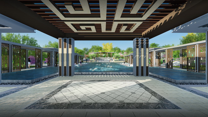 The back of the sales department, through the water courtyard cloisters to create a shocking visual effect. The end view makes use of the height difference to create a three-dimensional waterfall landscape. Closed cloisters can not only arouse people's yearning for courtyard life and play a guiding role in the traffic flow, but also enhance the dignity of the whole scene and highlight the style of the courtyard.